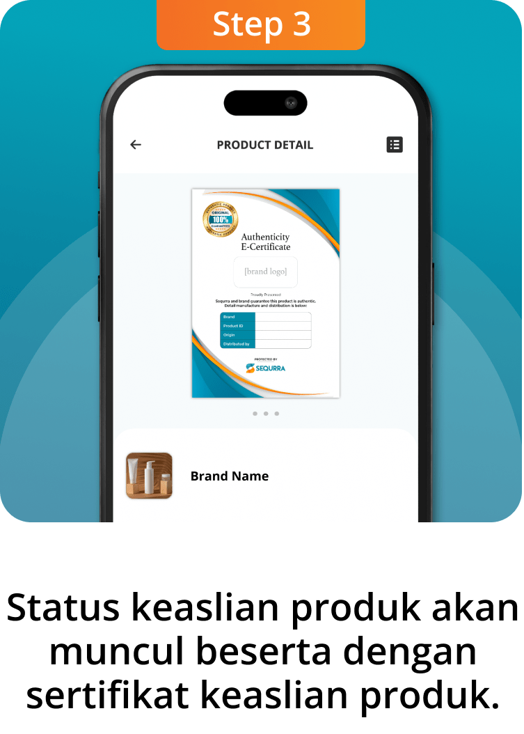 Cukup pindai QR Code Sequrra menggunakan kamera smartphone dan masukkan PIN tertera pada sticker. Jika produk asli, akan muncul halaman verifikasi resmi dari Sequrra yang menampilkan detail produk dan sertifikat keaslian.